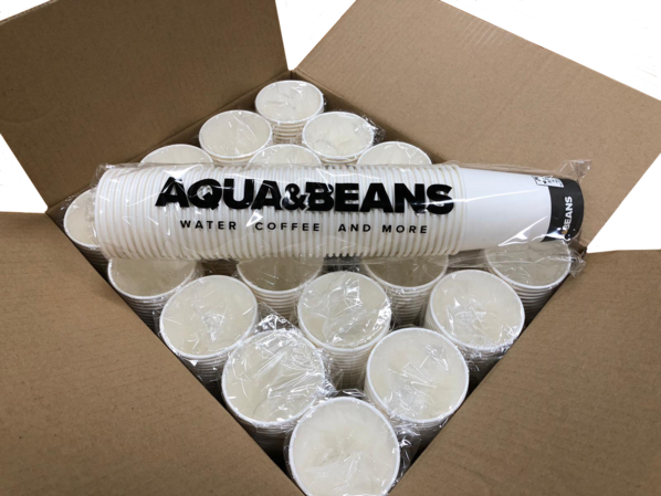 Aqua & Beans drinkbekers (180 ml inhoud en geschikt voor zowel water als koffie) van karton/papier van sublieme kwaliteit. Wilt u ook iets doen aan een beter milieu, gebruik dan papier in plaats van plastic bekertjes.