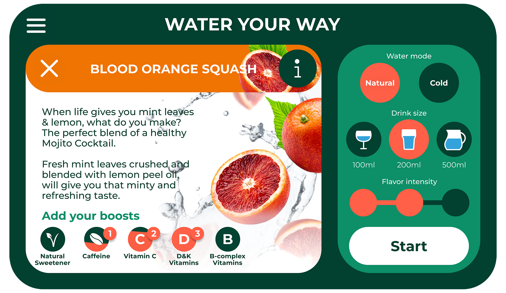 Via het gebruiksvriendelijke touchscreen kies je eenvoudig jouw drankje. Vervolgens personaliseer je het met natuurlijke smaken, vitamines of een cafeïneboost. Tap & klaar.